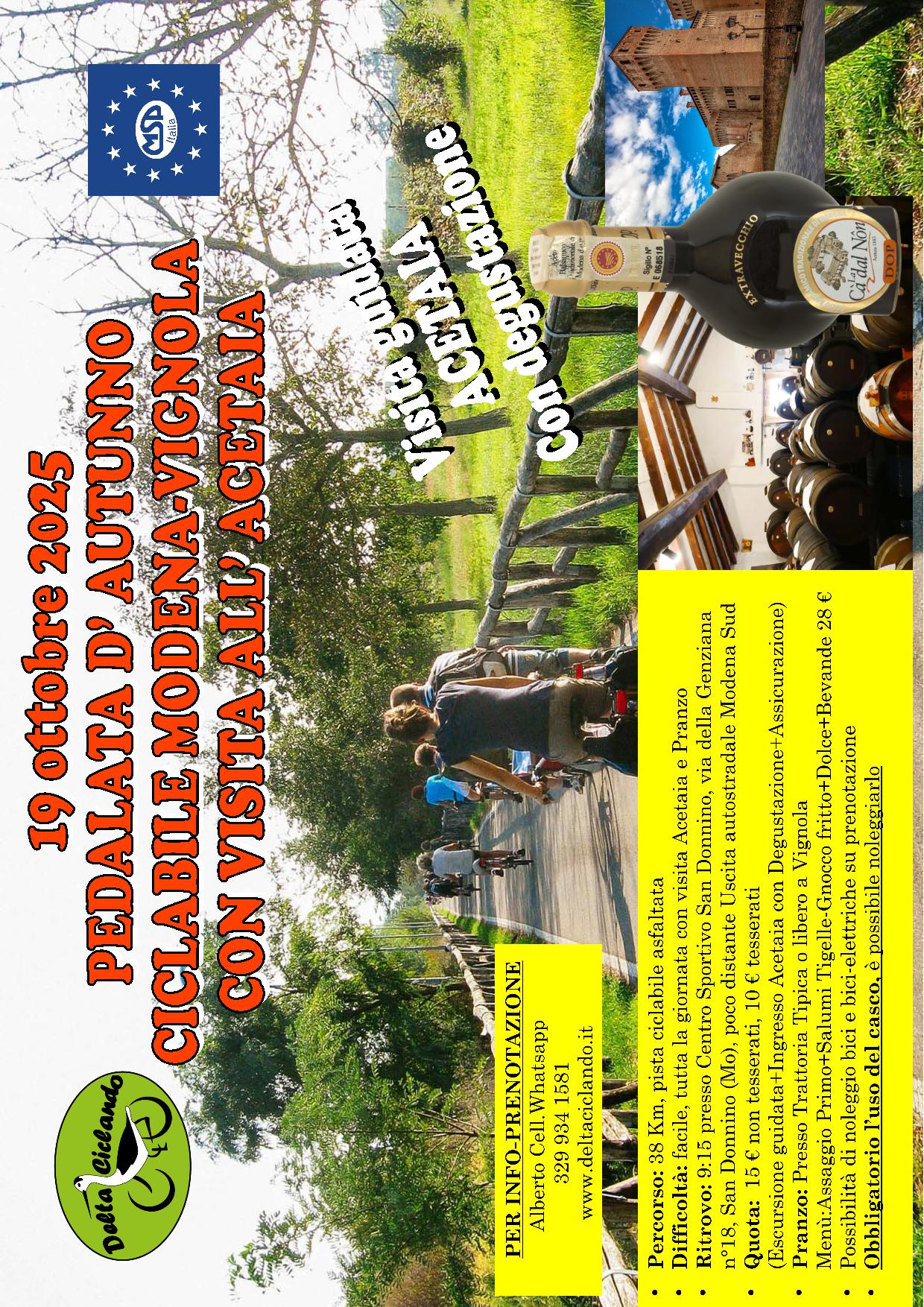 Pedalata con il foliage autunnale sulla ciclabile Modena-Vignola, sosta alla tradizionale Acetaia Modenese, con visita guidata e degustazione del tradizionale Aceto Balsamico di Modena. Visita di Vignola e pranzo tipico Modenese con le Tigelle.